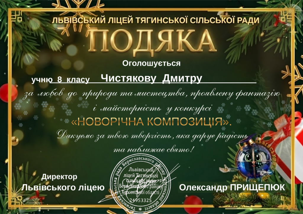 - Чистяков Дмитро, 8 клас – «Різдвяні мрії»;