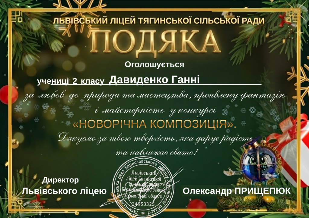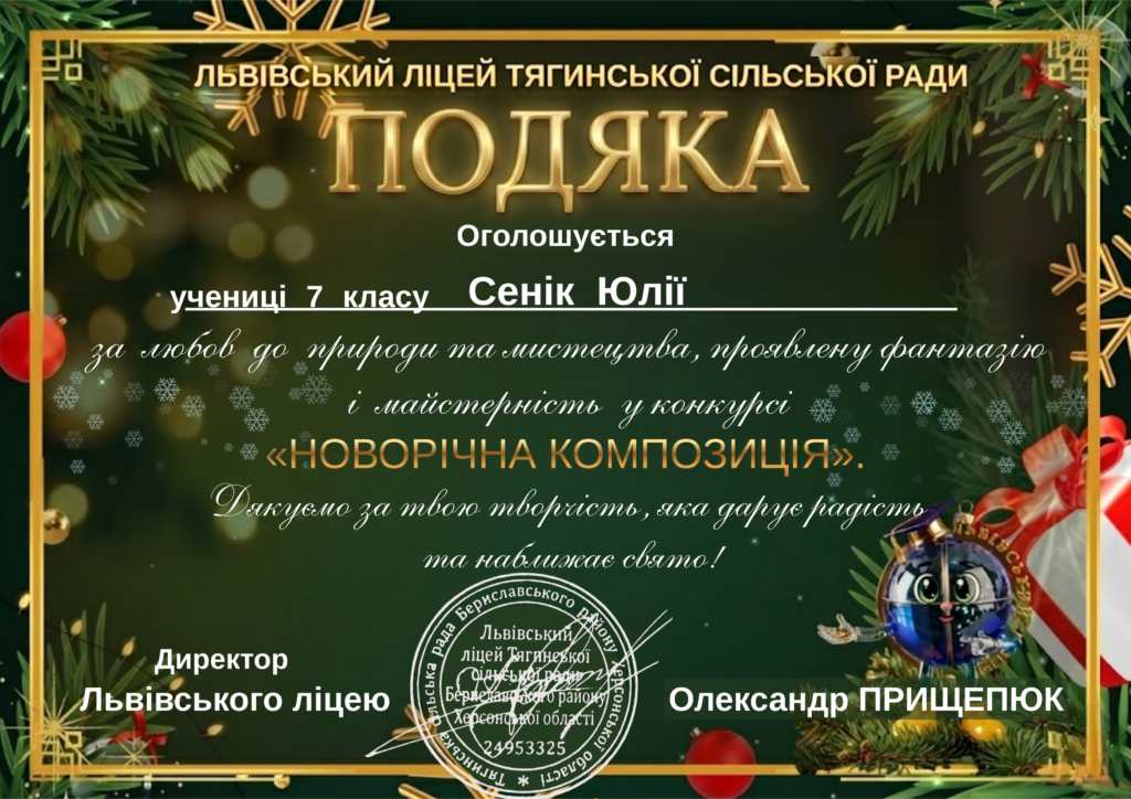 У Львівському ліцеї завершився шкільний етап Всеукраїнського конкурсу «Новорічна композиція». Цьогоріч, попри дистанційний формат, ми були вражені активністю наших учнів: на конкурс надійшло 23 креативні роботи від 17 учасників 1–8 класів.